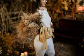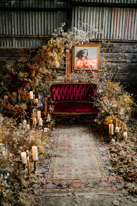 The Team: Photographer: Makers Hands, Concept, coord, styling & location: Wickerwood Farm, concept & floral design: Tales From, props & furniture co hire: The Toast & Wickerwood Farm, H&MU: Poppy Tallulah, Neon Art: Darren West, Jumpsuit: Melissa Odabash, Feather shoulder piece: Feathers and Thread, K9 model: Bodhi, Naturally dyed bouquet ribbon: The Natural Dye Works, Boots: Asos